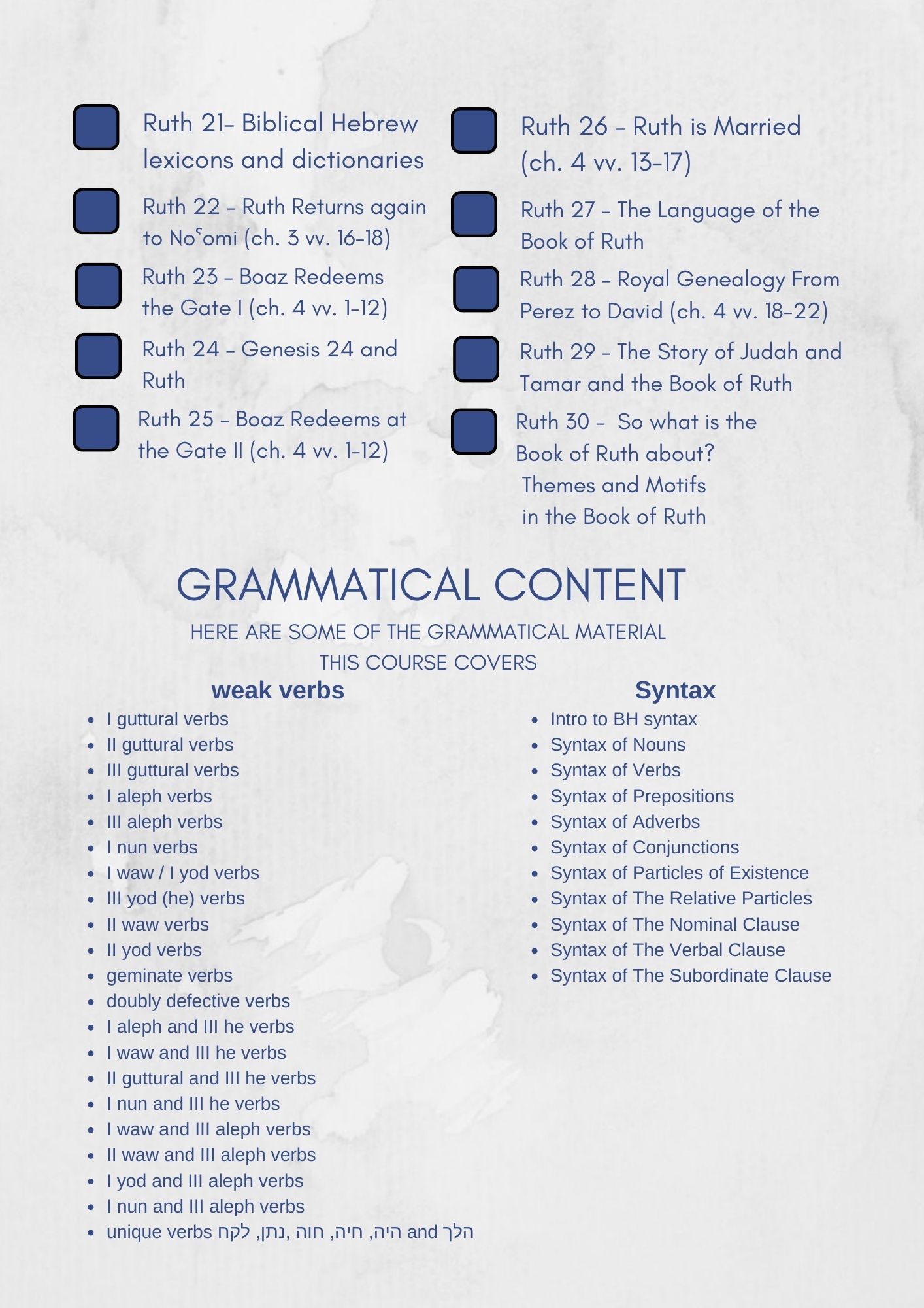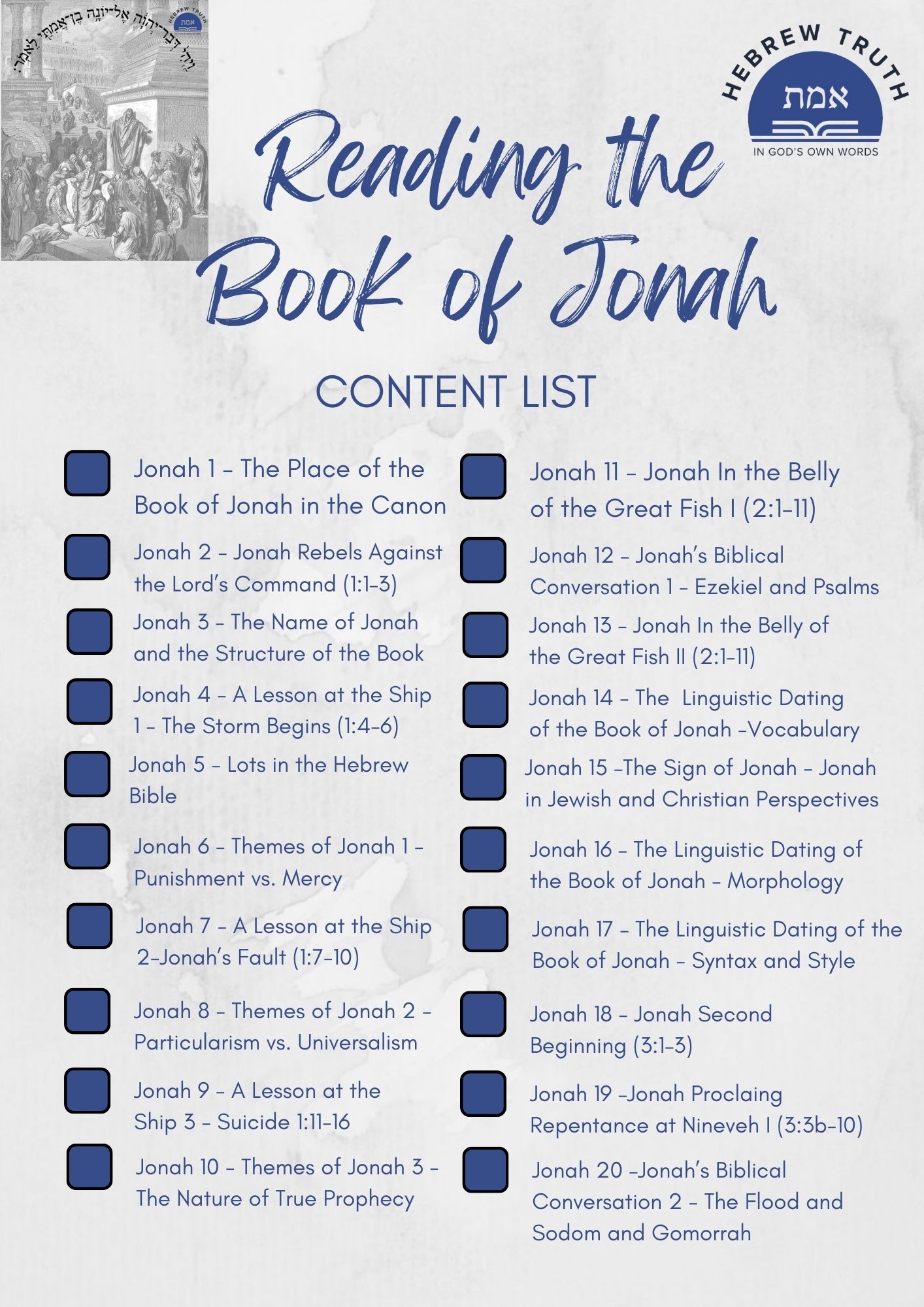 We will use the reading of the Book of Ruth to cement the grammatical knowledge required to become independent readers of biblical prose, and we will discuss textual and contextual issues of the book of Jonah